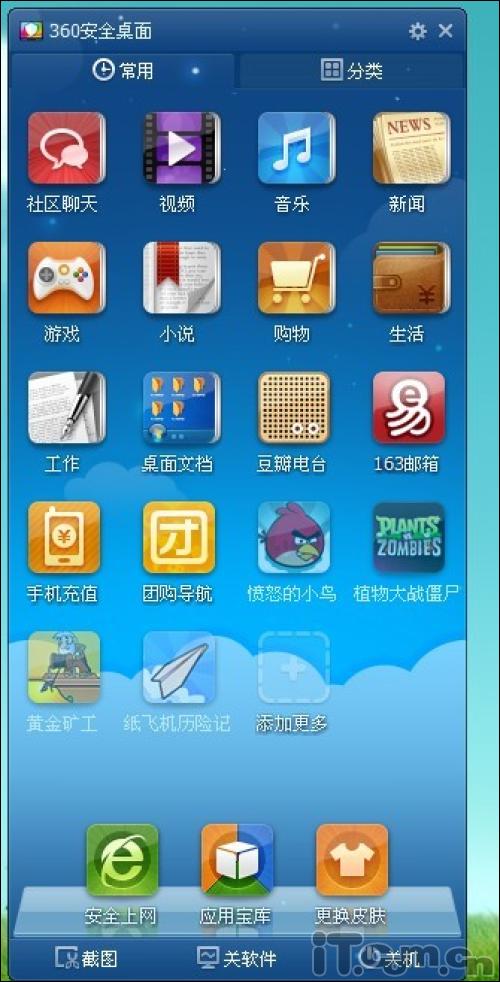 所謂360安全桌面就是整合了“社區(qū)聊天、視頻、音樂、新聞、游戲、小說、購物”等日常必備軟件的一款桌面管理軟件。