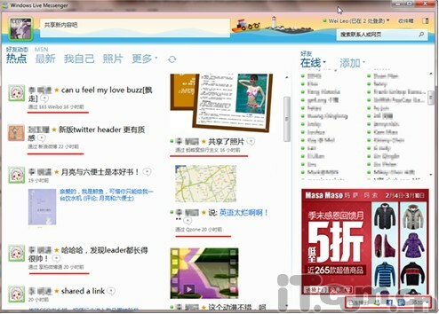 目前,使用Windows Live Messenger 2011的用戶可以在“社交面版”或“簽名狀態(tài)”看到好友通過MSN連接綁定Windows Live Messenger后發(fā)布在新浪微博或其他社交網(wǎng)站的信息。