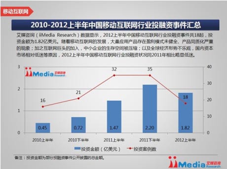 來自艾媒的數(shù)據(jù)顯示,2012年上半年獲得融資的案例是18起,數(shù)量較2011年下半年的35起比例下降49%,較去年同期的32起下降44%。