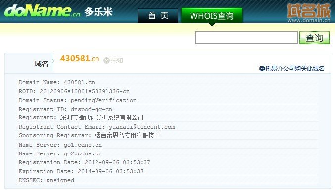 這數(shù)萬(wàn)個(gè).cn域名的DNS均設(shè)置為go1.cdns.cn和go2.cdns.cn。而我們通過(guò)域名WHOIS信息查詢可知,這2組DNS為中國(guó)互聯(lián)網(wǎng)絡(luò)信息中心所有,也就是cnnic。這正是與前幾日?qǐng)?bào)道的騰訊與cnnic合作,CN域名可成為QQ空間入口相吻合。并且這些域名到期時(shí)間全部為2014年。騰訊和CNNIC合作的合約難道為2年期?