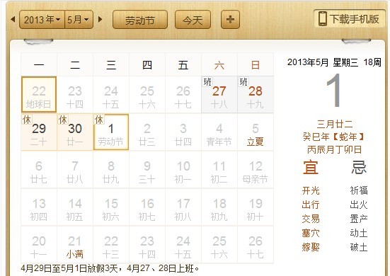 4月27日(星期六)4月28(星期日)上班,4月29日至5月1日放假調(diào)休,共3天。5月2日正式上班,放假時間如下圖: