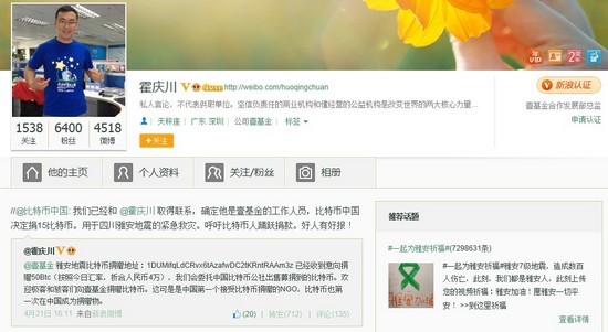 昨日下午,霍慶川在微博上宣布,壹基金已經(jīng)收到意向捐贈(zèng)50Btc(按照當(dāng)日匯率,折合人民幣4萬元)并將委托中國比特幣公社出售募捐到的比特幣,同時(shí)歡迎極客和駭客們向壹基金捐贈(zèng)比特幣。之后,比特幣中國宣布,決定向壹基金捐贈(zèng)15比特幣,用于四川雅安地震的緊急救災(zāi)。