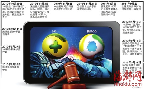 另外,來(lái)自法律的裁判總有滯后期。奇虎360發(fā)布“扣扣保鏢”是在2010年10月29日,騰訊要求QQ用戶“二選一”是在2010年11月3日。而廣東省高院作出一審判決則到了2013年。