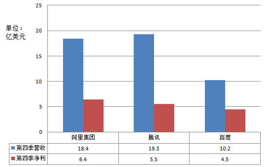 阿里巴巴集團、騰訊和百度去年第四季度業(yè)績