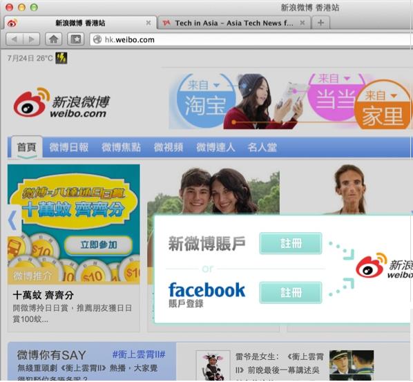 Techinasia稱,用戶打開新浪微博香港版和臺(tái)灣版后,點(diǎn)擊右上角的灰色“注冊(cè)”按鈕,系統(tǒng)會(huì)自動(dòng)彈出通過Facebook賬號(hào)登陸新浪微博的選項(xiàng)。但目前面向北美市場的新浪微博英文版(engish.sina.com)還未出現(xiàn)通過Facebook賬號(hào)登陸的選項(xiàng)。