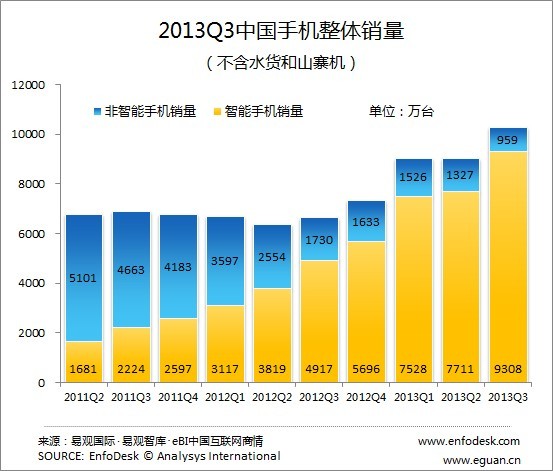 根據(jù)Enfodesk易觀智庫最新發(fā)布的《2013年第3季度中國手機(jī)市場監(jiān)測報告》顯示,3季度中國手機(jī)(不含水貨和山寨機(jī))銷量為10266萬臺,環(huán)比增長13.6%,同比增長54.5%。其中,智能手機(jī)銷量為9308萬臺,環(huán)比增長率為20.7%,同比增幅更是高達(dá)89.3%。智能手機(jī)占整體市場份額持續(xù)上升至90.7%。
