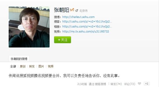 張朝陽否認(rèn)搜狐視頻與騰訊視頻合并傳聞