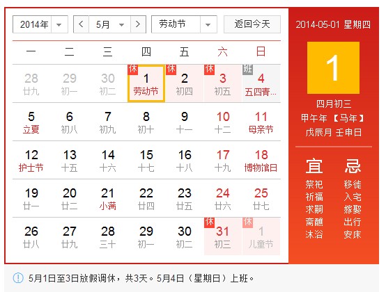 2014年5月1日(星期四)—2014年5月3日(星期六)放假調(diào)休,共三天。2014年5月4日(星期天)照常上班。