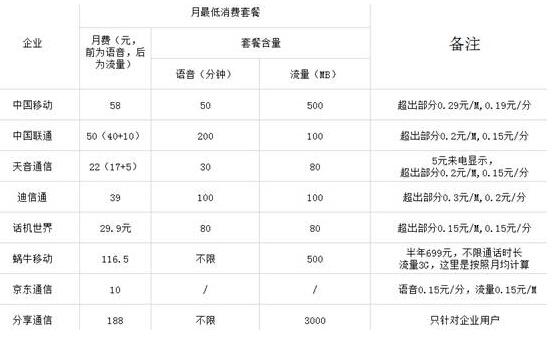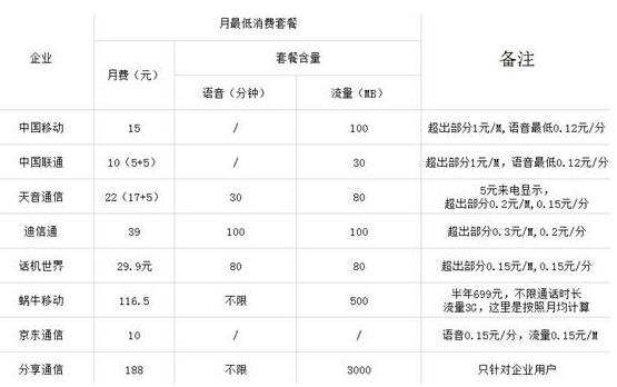 從表格中可以看出,一部分虛擬運(yùn)營商入門門檻較低,如天音通信、話機(jī)世界、京東通信等,月最低消費(fèi)均在30元以下,這些企業(yè)對(duì)于消費(fèi)能力較低的用戶來說,確實(shí)是不錯(cuò)的選擇。