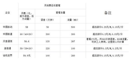 虛擬運(yùn)營商的資費(fèi)套餐是否真如其宣傳那樣“美好”。由于各家企業(yè)套餐資費(fèi)并不一致,我們以56-60元的月套餐維度來進(jìn)行比較。