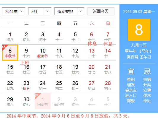 2014年中秋節(jié)在即,為了便于提前安排好工作和生活,現(xiàn)根據(jù)國務院辦公廳通知精神及公司的福利政策,將中秋節(jié)期間的放假安排通知如下: