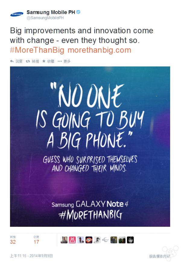 威鋒網(wǎng) 9 月 10 日消息,今天凌晨蘋果在自己的秋季產品發(fā)布會上發(fā)布新款的 iPhone 手機,iPhone 6 和 iPhone Plus。兩款新 iPhone 都使用大屏的設計理念,并喊出了“Bigger than bigger”的口號。而就在這兩款新的 iPhone 發(fā)布之后三星菲律賓就在推特上引用了喬布斯的當年所說過的“沒有人會想要購買大屏手機”來嘲諷蘋果推大屏 iPhone 的行為,并且表示“猜猜是誰讓他們(蘋果)最終改變了不推大屏手機的想法”。