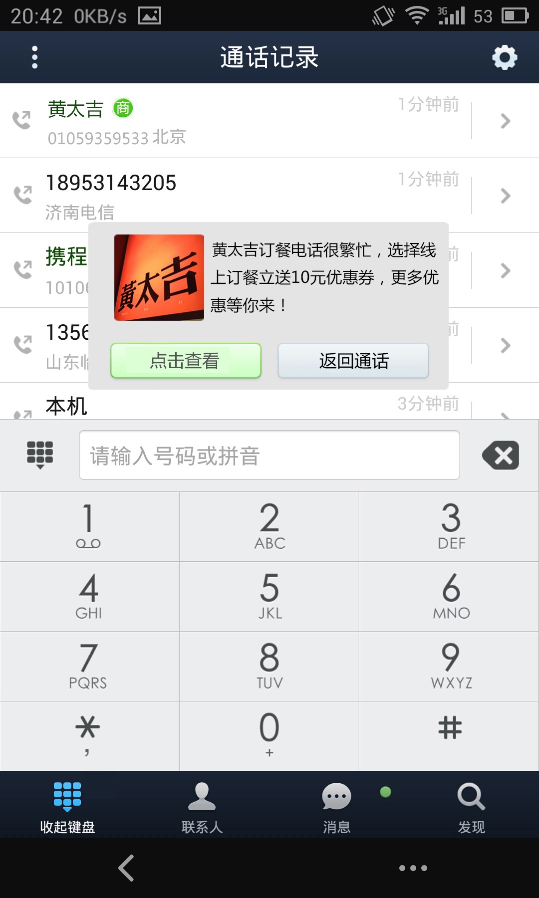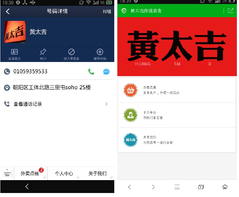 以最近人氣火爆的黃太吉煎餅為例,顧客在給黃太吉打了一個(gè)送餐電話后,即自動(dòng)關(guān)注了黃太吉來店。隨后,黃太吉主動(dòng)推送最新商品服務(wù)信息,顧客在360通訊錄中看到未讀信息,點(diǎn)擊進(jìn)入后即可查看到黃太吉其他店鋪的相關(guān)信息,并可在線訂餐及商家導(dǎo)航。值得關(guān)注的是,當(dāng)中午訂餐熱線繁忙時(shí),來店會(huì)提醒用戶轉(zhuǎn)為在線訂餐,并實(shí)時(shí)推送在線訂餐的優(yōu)惠信息,從而避免了因電話不通而造成的客戶流失。