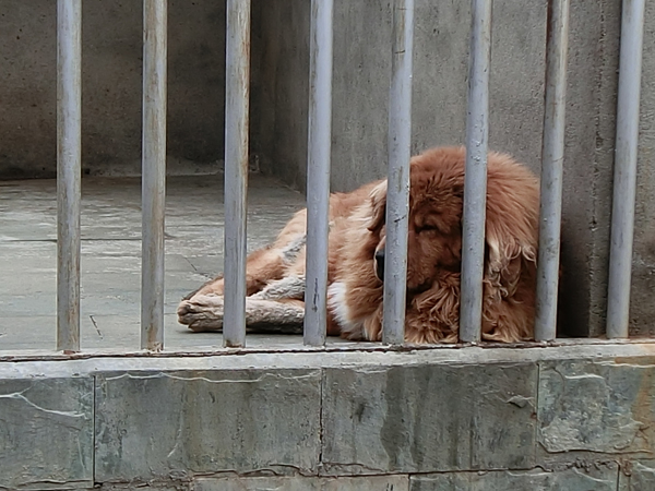 匆匆吃過9點鐘的午飯,繼續(xù)上路,在中午11點半趕到黃龍景區(qū)休息點,關(guān)著很多藏獒供游客參觀,
