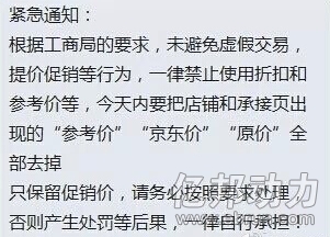 商家截圖顯示,京東已經(jīng)發(fā)布緊急通知,稱工商局要求,一律禁止電商平臺使用折扣和參考價等信息,因此,商家必須在今天內(nèi)把店鋪和承接頁面出現(xiàn)的所有“參考價”“京東價”“原價”等字眼全部去掉;商家只能保留促銷價。