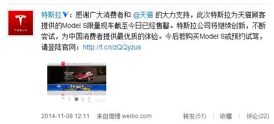 11月8日,特斯拉公司午間發(fā)布微博稱,特斯拉為天貓顧客提供的Model S限量現(xiàn)車截至已經(jīng)售罄,今后消費(fèi)者若需購買Model S或預(yù)約試駕,需登錄特斯拉官方網(wǎng)站。目前,天貓?zhí)厮估炫灥暌殃P(guān)閉,所有車型信息均已下線,此前已交付定金的用戶,特斯拉會(huì)繼續(xù)為其服務(wù)直至整個(gè)服務(wù)完成。