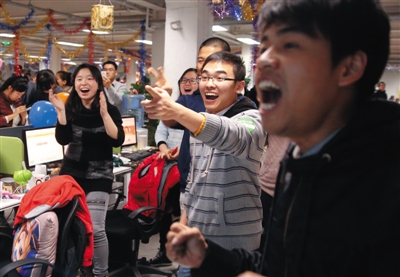 部分員工看著不斷攀升的銷售額,發(fā)出歡呼。新京報記者 李冬 攝