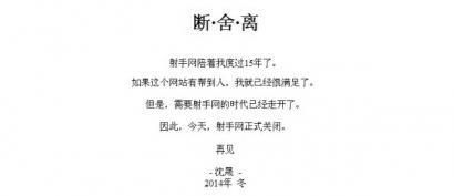 22日,知名字幕分享網(wǎng)站射手網(wǎng)創(chuàng)始人沈晟發(fā)表了一則名為“斷·舍·離”的公告,宣布“射手網(wǎng)正式關(guān)閉。”