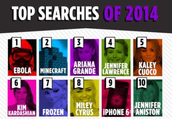 排在榜首的自然是埃博拉,各種傳言與恐懼已經(jīng)遠(yuǎn)遠(yuǎn)大于疾病本身,也是網(wǎng)友搜索的焦點(diǎn)。Minecraft《我的世界》游戲位居第二,艷照門主角詹妮弗·勞倫斯(Jennifer Lawrence)第四。從不缺少話題的社交名媛金·卡戴珊(Kim Kardashian)憑借臀部放置酒杯接香檳再次走紅社交網(wǎng)絡(luò),位列第六?!侗┢婢墶冯娪芭琶谄?,娛樂(lè)圈常青樹、《老友記》演員詹妮弗·安妮斯頓(Jennifer Aniston)在iPhone 6之后,排第十。