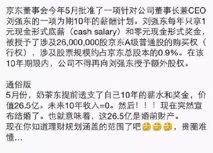 通俗點(diǎn)來說,5月份,劉強(qiáng)東提前透支了自己10年的薪水和獎(jiǎng)金,價(jià)值26.5億,未來10年收入等于0,這也就意味著這26.5億是婚前財(cái)產(chǎn)。網(wǎng)友們紛紛表示同情:“那意思是章澤天離婚的話......結(jié)婚期間她自己掙的錢還要分給劉強(qiáng)東......心疼她。我決定好好學(xué)法了。”有網(wǎng)友則為奶茶妹妹打抱不平,稱“劉強(qiáng)東心機(jī)太重,這是赤裸裸的不信任,已經(jīng)想不出兩人結(jié)婚的理由了。”