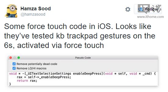 具體來(lái)說(shuō),Hamza Sood在iOS9中發(fā)現(xiàn)了一段代碼,可以讀取屏幕壓力并選取UI文本,然而,該代碼在他使用的iPhone6上被標(biāo)記為“False”,換句話(huà)說(shuō),F(xiàn)orceTouch功能將出現(xiàn)在下一代iPhone6s、iPhone6s Plus上。