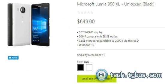 上周在官方在線商城開啟了兩次預(yù)訂工作之后,今天早些時候微軟在美國地區(qū)正式發(fā)售Lumia 950 XL,在上線數(shù)小時之后這款旗艦機型宣布售罄。目前感興趣的用戶可以預(yù)留郵件地址,一旦到貨上線將會及時通知你。根據(jù)信息顯示所有Lumia 950 XL的訂單將于12月11日開始發(fā)貨,而根據(jù)此前曝光的信息首批預(yù)訂用戶已經(jīng)開始發(fā)貨了。