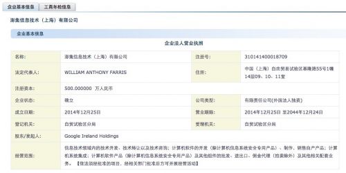 工商資料顯示,澎集信息成立于2014年12月25日,股東為Google Ireland Holdings(谷歌愛爾蘭控股),法人代表是William Anthony Farris,注冊(cè)資本為500萬元。該公司的經(jīng)營范圍包括:信息技術(shù)領(lǐng)域內(nèi)的技術(shù)開發(fā)、技術(shù)轉(zhuǎn)讓以及技術(shù)咨詢;計(jì)算機(jī)軟件的開發(fā)(除計(jì)算機(jī)信息系統(tǒng)安全專用產(chǎn)品)、制作,銷售自產(chǎn)產(chǎn)品;計(jì)算機(jī)系統(tǒng)集成;計(jì)算機(jī)軟件產(chǎn)品(除計(jì)算機(jī)信息系統(tǒng)安全專用產(chǎn)品)及其他組件的批發(fā)、進(jìn)出口、傭金代理(拍賣除外)及其他相關(guān)配套業(yè)務(wù)。