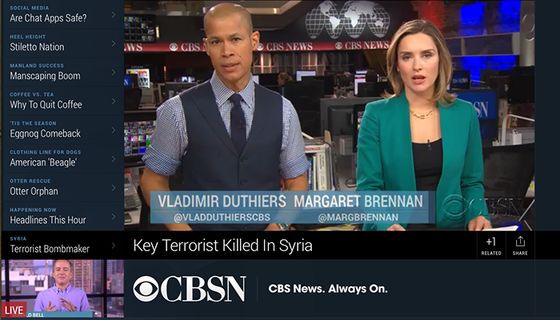 2014年底,CBSN首先在Xbox One提供,后來到達(dá)Amazon Fire TV,Android TV,Apple TV,Roku等平臺。這些平臺的共同特點(diǎn)就是類似國內(nèi)小米、樂視等盒子或互聯(lián)網(wǎng)電視機(jī),存在繞過有線或無線電視網(wǎng)觀看視頻節(jié)目的方法,也就是所謂的OTT服務(wù)。除此之外,CBSN也可以在CBS新聞的官方網(wǎng)站、iOS和Android客戶端收看。