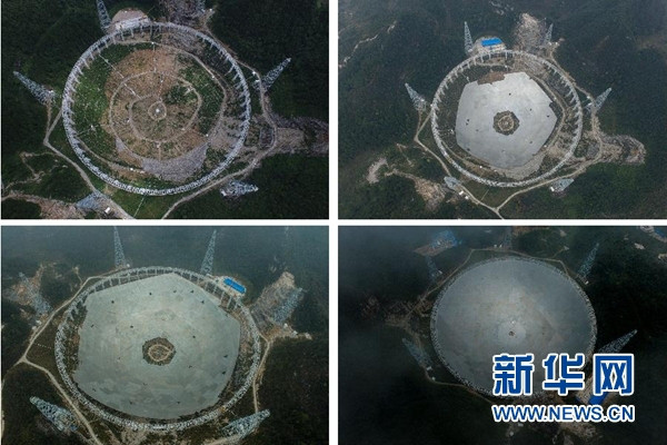 這張拼版照片為FAST項(xiàng)目拼裝第一塊反射面板(左上,2015年8月2日攝)、FAST反射面板安裝近半(右上,2015年12月16日攝)、FAST項(xiàng)目反射面板安裝近八成(左下,2016年3月9日攝)、FAST項(xiàng)目反射面板安裝完成(右下,2016年7月3日攝)。新華社記者 歐東衢 攝