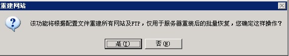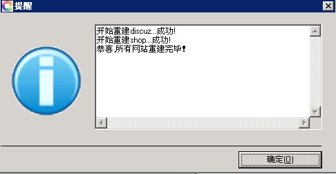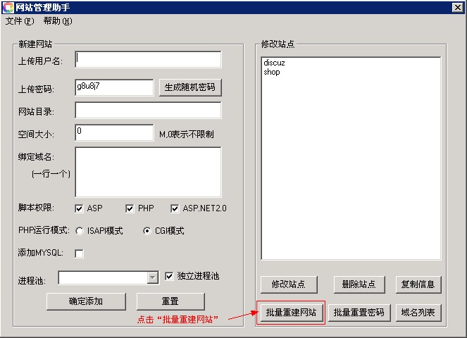 3、點(diǎn)擊提示對(duì)話框,會(huì)自動(dòng)打開“網(wǎng)站管理助手”,點(diǎn)擊“批量重建站點(diǎn)”,系統(tǒng)會(huì)自動(dòng)重建用戶賬戶、IIS站點(diǎn)、FTP和mysql。重建成功后會(huì)有相應(yīng)提示。