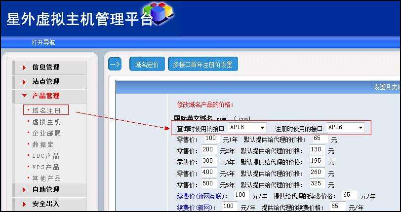 然后點(diǎn)擊“產(chǎn)品管理”——“域名注冊(cè)”,將右側(cè)的所有域名查詢(xún)接口和注冊(cè)接口都選擇“API6”,如圖: